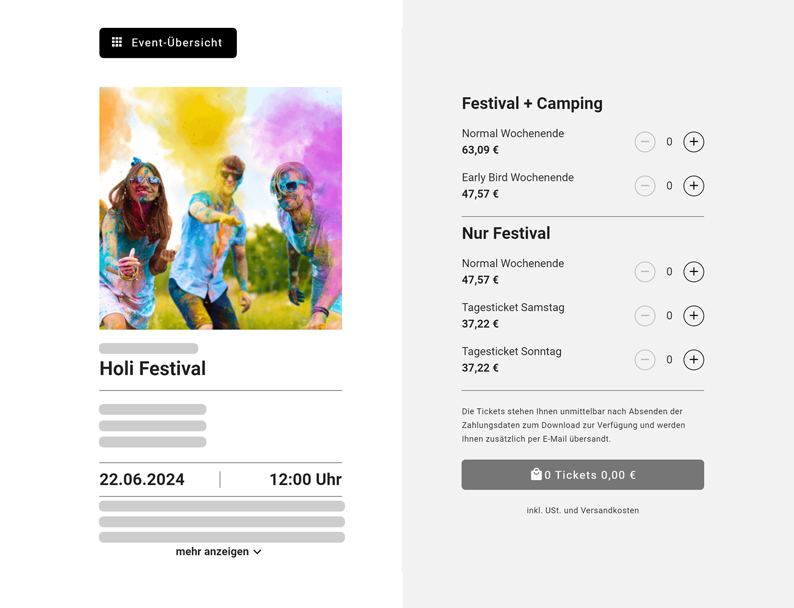 Ta din biljettförsäljning till en ny nivå och använd vårt enkla självbetjäningsverktyg. Skapa din egen professionella online shop i din design med bara några få steg, erbjud tilläggstjänster som t.ex. camping, VIP och använd den stora räckvidden hos eventim.se - enkelt, snabbt och säkert.