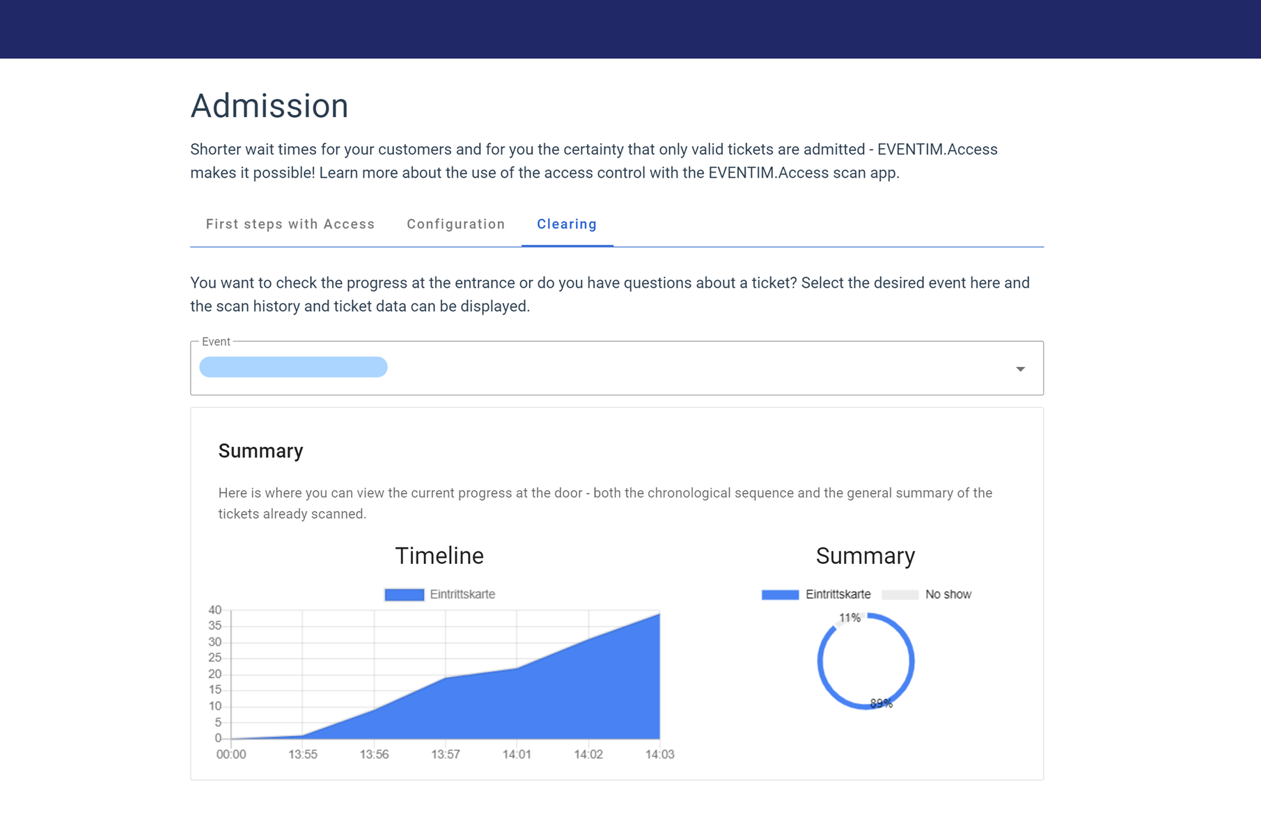 Always keep an exact overview of the admission process. The scan app shows you directly how many tickets have already been scanned. The reporting in your EVENTIM.Light account also gives you a detailed insight into the admission process. For example, you can see at what time the rush was particularly high, how many people are already there and which ticket categories were scanned how often. With the help of this data, you can improve the process on site or optimize admission for future events.